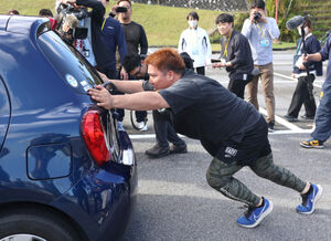 【画像:【ソフトバンク】自動車に〝どすこい〟日本人最速300号へ右の大砲が1トン車を坂道で押し出し!】